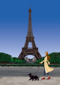 イラスト説明 パリ エッフェル塔を背景に朝の散歩をする風景、海外作品第一弾です。今回の犬モデルはイングリッシュコッカースパニエルです